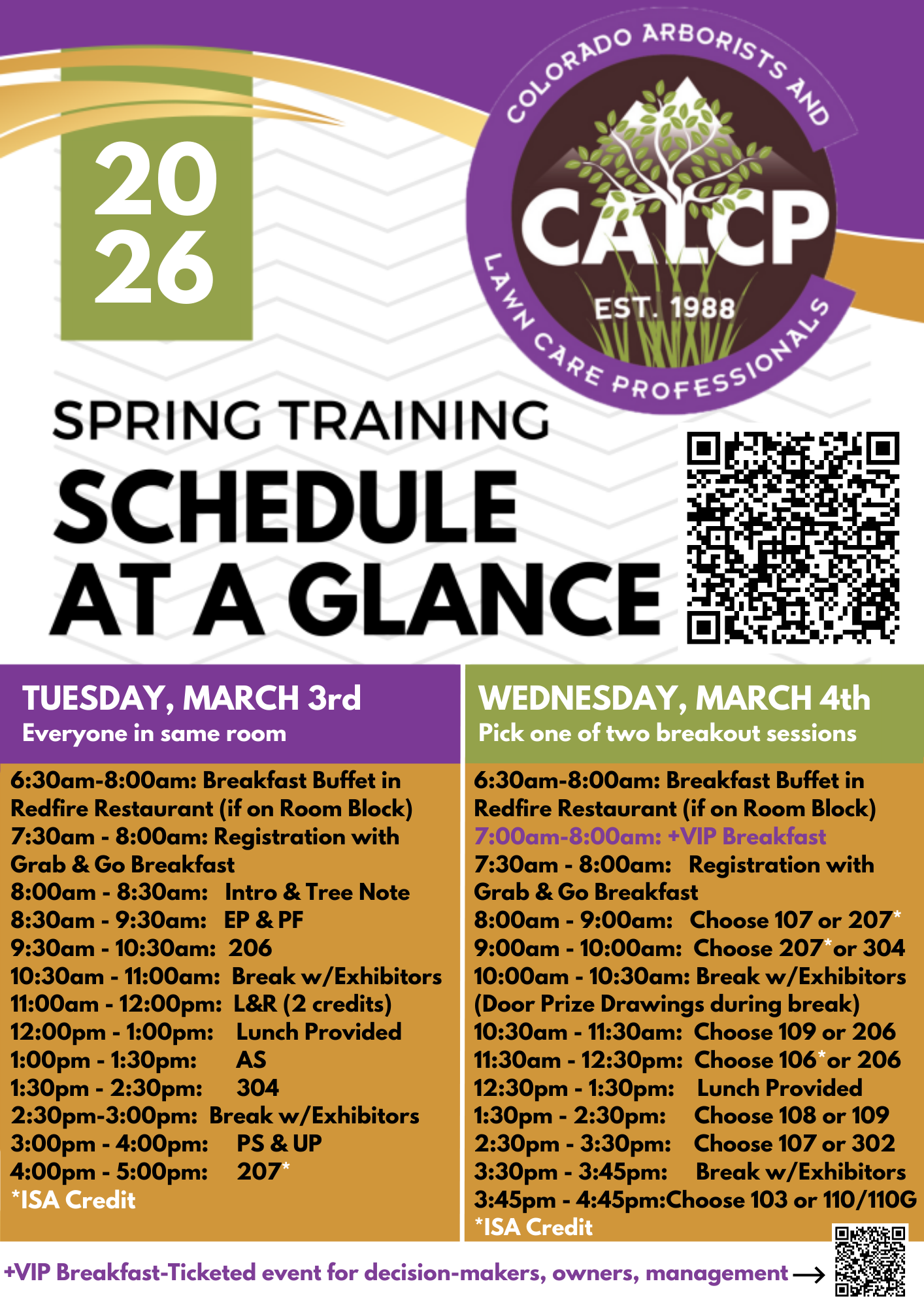 CANCELLATION POLICY: Registration cancellation requests must be submitted via email to calcp@treeandlawncareco.org. Full refunds minus 10% of the registration cost are available through February 3, 2026. From February 4, 2026, through February 20, 2026, 50% refunds will be offered. Cancellations requests sent after February 20, 2026, are not eligible for a refund.